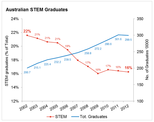 I believe it is my duty to ensure my charges leave my care with the best tools in hand to succeed and prosper in their future endeavours; this means a well-rounded and rigorous STEM education (OCS, 2014b, p. 5). Looking at current numbers for Australia is staggering. The graph found in Figure 3a shows the decline in STEM graduates in times of rising overall graduate numbers. Educators need to connect their efforts to improve STEM graduation numbers.