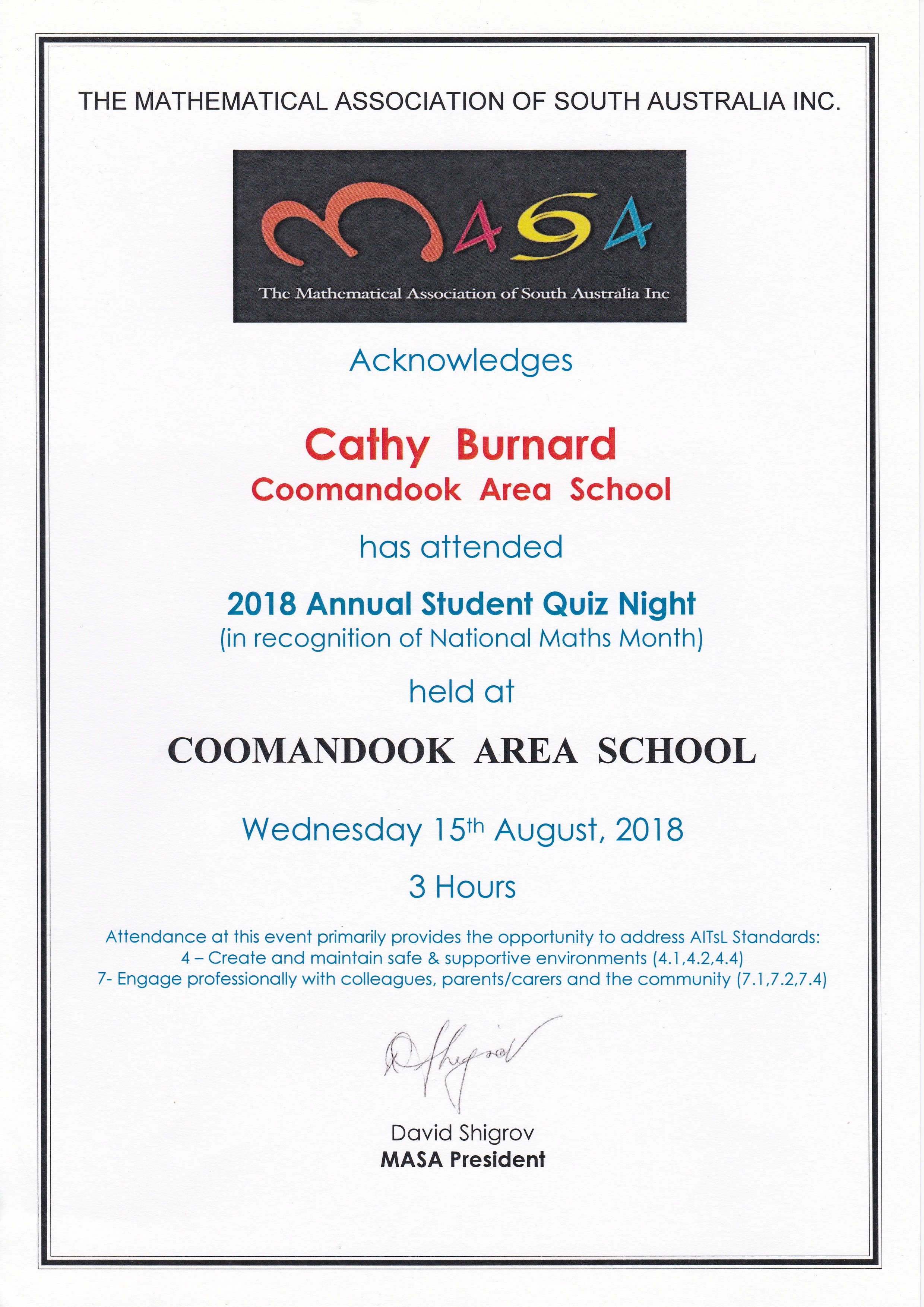 During my placement at Coomandook Area School I attended the Mathematical Association of South Australia Student Quiz Night as a student supervisor and quiz marker. I was able to network with colleagues from schools in the district and help to create a safe and supportive environment for students to participate in the quiz (4.1, 4.2, 4.4, 7.1, 7.2, 7.4).