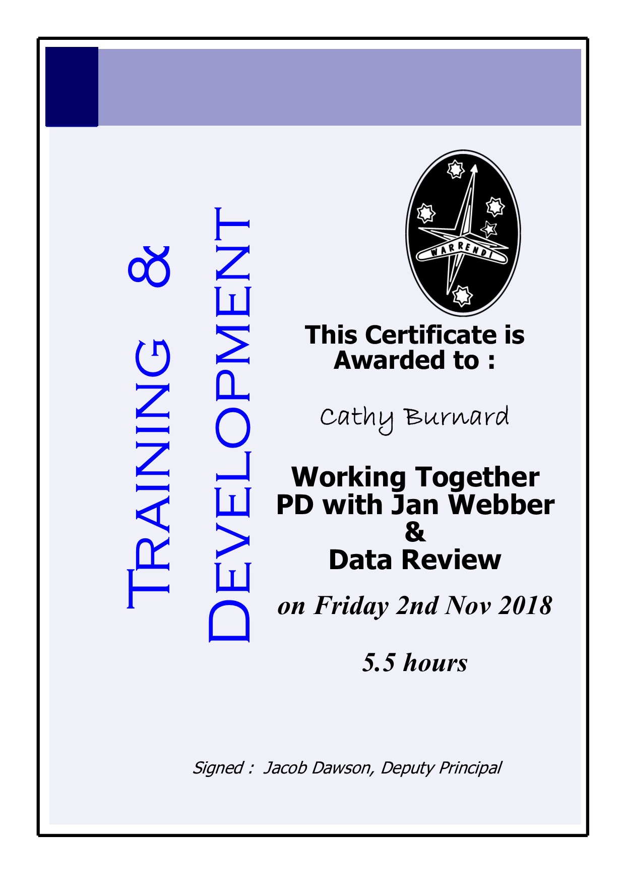 While on professional placement at Coomandook Area School I attended a full day of professional development. The morning session, presented by Jan Webber, focused on understanding the different personalities present in a workplace and how to work together effectively. In the afternoon, staff analysed trends in Progressive Achievement Test (PAT) and National Assessment Program – Literacy and Numeracy (NAPLAN) results to identify problems of practice and inform the site improvement plan (5.4, 6.2, 7.1, 7.2).